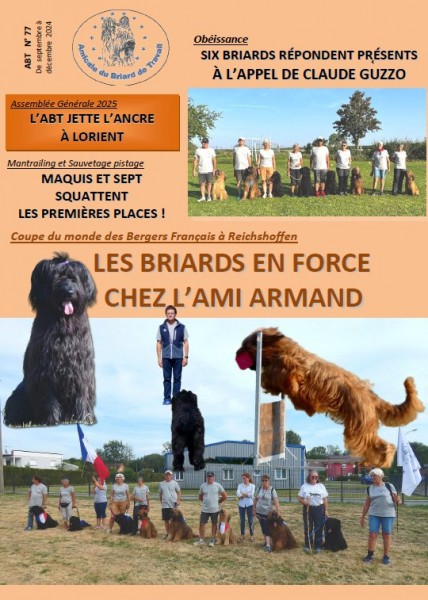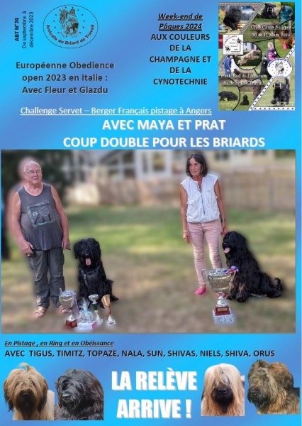 (posté par Admin le 22/07/2024 à 14h 35 Résultats de nos Briards au challenge des Bergers Français 2024 organisé par le club de Villefranche sur Saône les 19-20& 21 Juillet 2024 Juge en Libre : Alain Chiali - Juges au Trait : Alain Pain - Maurice Malaisé Cette année les bergers français étaient noyés parmi les très nombreuses races inscrites à ce concours. En échelon 1 Jean Louis Duvalet et Maya de la Cité Paradis : L 92 - T 80 = 172/200 - Exc - 4ème/12. L'équipe remporte le challenge Marcel Servet en 1poir la deuxième année consécutive En échelon 2 Pascale Guihaire et Prat ar Coum de Ki Denved : L90 - T 98.75 = 188.75/200 - Exc - 1ère ex aequo / 20 rend toutefois la 2eme place l'autre chien étant le plus jeune. Elles remportent pour la deuxième année consécutive le challenge Marcel Servet en 2 Valérie Poncin et Suly des Briards de l'Orris : L 0 - T 91 = 91/200 - NC En échelon 3 Dominique Coquerie et Mayday de la Buissonière : L 0 - T 81 = 81/200 - NC