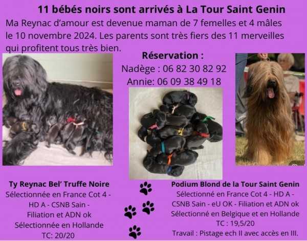 (posté par Sophie Le Lin Loiseau le 03/05/2025 à 12h 56 Les 1ers Bergers de Brie Du Château Melen sont nés le 02 mai 2025 du mariage de SAFIA de NEDJMA FN ID 250269590588974 A/B Cot 3 CSNB Free DNA CSAU / NHAT / Travail sur troupeau de chèvres au quotidien / pratique le mantrailing et de ODIN (O'Floki) Des PLAINES du VALHALLA MN A/A Cot 3 CSNB Free DNA CSAU / NHAT / HWT / BREVET OB / Travail sur troupeau de chèvres au quotidien Une portée de 8 chiots noirs composée de 3 mâles et 5 femelles. Sophie Le Lin Loiseau : 06 03 16 65 26 https://duchateaumelen.chiens-de-france.com/berger-de-brie?tag=cdf |