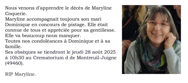 (posté par Admin le 26/08/2025 à 22h 57 Nous venons d'apprendre la terrible nouvelle. publiée sur la page FB du Groupe Pistage Français Dominique et Maryline étaient des piliers fidèles et inséparables de nos week-end ABT, et des concours de Pistage. Toutes nos pensées vont à Dominique et sa famille pour surmonter cette douloureuse épreuve. L'ABT gardera de Marilyne le souvenir de sa gentillesse, de son courage et de sa joie de vivre. Le comité de l'ABT |