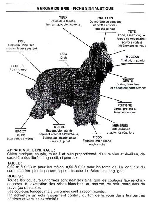 Le Briard actuel est un chien rustique, de taille moyenne, harmonieux et très élégant, dont le corps solide, bien charpenté et musclé est recouvert d'un pelage long parfois abondant.